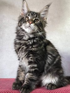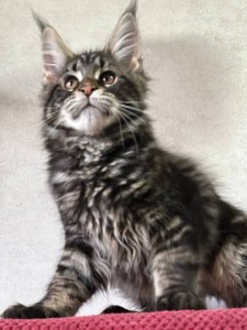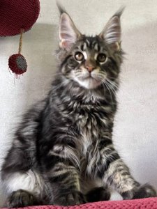 At just a few months old, Aaron is already showcasing the hallmark features of the Maine Coon kittens. Aaron exudes elegance and charm from his luxurious long fur and tufted ears to his fluffy tail and expressive green eyes.