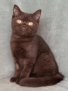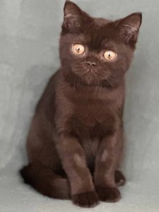 Clyde’s velvety fur beckons for cuddles, showcasing the elegance of British Shorthair kittens. His round face, complete with chubby cheeks and large, expressive eyes, radiates warmth and friendliness. At just a few months old, Clyde already displays all the classic traits of his beloved breed.