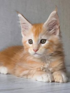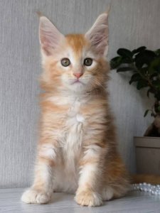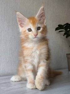 At just a few months old, Dark is already showcasing the signature traits of Maine Coon kittens—his long, flowing fur, tufted ears, and fluffy tail give him an air of elegance, while his bright green eyes sparkle with curiosity.