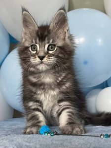 Dexter’s luxurious long fur, tufted ears, and fluffy tail perfectly showcase the elegance of Maine Coon kittens. His expressive green eyes sparkle with curiosity and intelligence, making him a captivating companion. At just a few months old, Dexter is already displaying the signature traits of his breed—playful, curious, and full of charm.