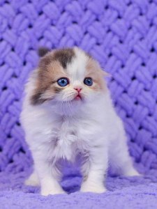 Diva’s soft, fluffy coat, signature folded ears, and big, round eyes make her a stunning example of Highland Fold kittens. Her playful yet gentle spirit makes her the perfect combination of elegance and fun. Even at just a few months old, she already showcases the grace and charm of her breed.