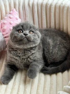 Elena’s plush, soft coat and gentle demeanor reflect the very best of Scottish Fold kittens. Her round face, adorned with expressive eyes and those unmistakable folded ears, radiates warmth and charm. Even at just a few months old, Elena perfectly embodies her breed’s beauty and endearing traits.