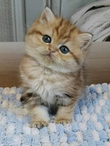 At just a few months old, Ella proudly showcases the signature traits of the British Shorthair kittens. Her short, plush fur, round face with chubby cheeks, and large, expressive eyes make her absolutely irresistible.