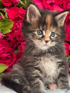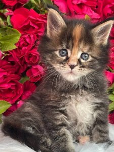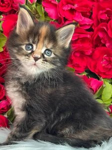 Meet Elmira, the majestic and playful purebred Maine Coon kittens who embodies the grandeur and sweetness of this beloved breed. With her striking features and gentle nature, Elmira is already a heart-stealer at just a few months old.