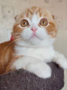 At just a few months old, Ferrero Rocher already showcases the hallmark features of the Scottish Fold breed — his distinctive folded ears, perfectly round face, and plush, velvety coat. His big, expressive eyes sparkle with curiosity and warmth, melting hearts wherever he goes.