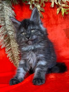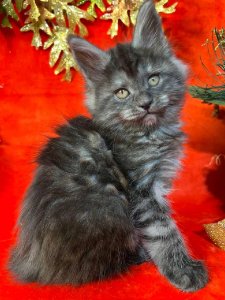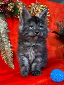 At just a few months old, Fifa already displays the hallmark traits of the Maine Coon kittens – her tufted ears, fluffy tail, and striking green eyes highlight her undeniable beauty. Her playful and curious nature promises endless joy and delightful moments.