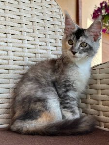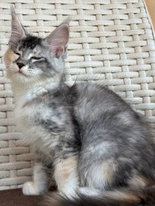 Say hello to Graffiti, a purebred Maine Coon kitten whose striking looks and lively personality make her truly unforgettable. With her flowing long fur, tufted ears, and luxuriously fluffy tail, Graffiti is a picture of elegance wrapped in playful energy.