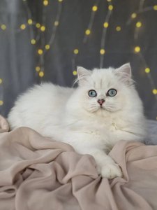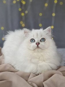 Grant’s long, fluffy coat, round face with chubby cheeks, and mesmerizing green eyes are classic features of the British Longhair kittens. At just a few months old, his gentle personality and loving nature make him a delightful addition to any family.