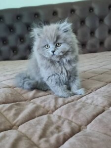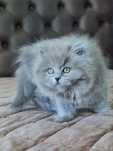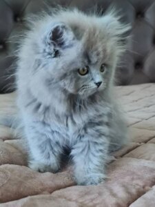 Halva’s fluffy coat beckons for your touch, offering a glimpse into the timeless elegance of Highland Straight kittens. Her big, round eyes and straight ears add to her irresistible charm. At just a few months old, Halva already displays the hallmark features of her breed.