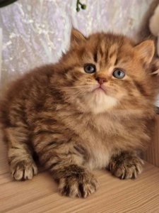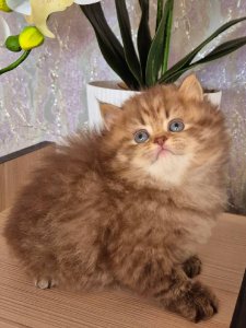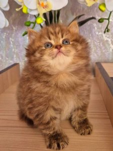 Her round face, darling chubby cheeks, and large, soulful eyes make her a shining example of a true British Longhair kittens. Every stroke of her silky coat is a reminder of just how special she is, while her gentle demeanor promises endless moments of peaceful companionship.