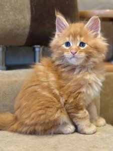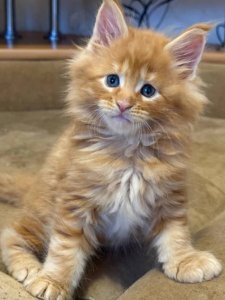 Kevin’s long, silky fur, tufted ears, and magnificent fluffy tail beautifully capture the signature elegance of Maine Coon kittens. His sparkling green eyes are full of curiosity and warmth, reflecting the sweet, intelligent nature that makes his breed so beloved. Even at just a few months old, Kevin already shines with the grandeur and loving soul that Maine Coons are famous for.