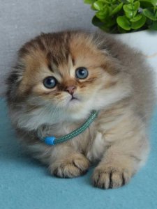 Even at just a few months old, Leo already displays the hallmark traits of the Highland Fold kittens—folded ears, large, round, expressive eyes, and a soft, fluffy coat perfect for cuddles.