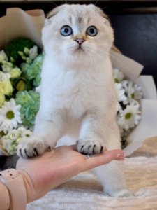Mel’s plush coat invites endless cuddles, and his sweet demeanor reflects the affectionate nature of Scottish Fold kittens. His distinctive folded ears and round face only add to his cuteness, making him the epitome of warmth and charm. At just a few months old, Mel already embodies the endearing traits of his breed.