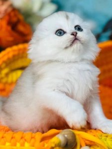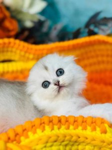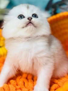 Introducing Mercedes, a purebred Highland Fold kitten whose gentle presence and playful spirit make her a standout companion. With her distinctive folded ears, round eyes, and luxuriously fluffy coat, Mercedes is as enchanting as she is affectionate.