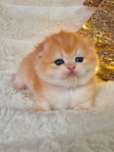 Merry’s unique folded ears and perfectly round face showcase the irresistible charm of Scottish Fold kittens. Her soft, plush coat and gentle, playful demeanor make her a joy to have around, bringing warmth and happiness to any home. At just a few months old, Merry is already a shining example of her breed’s endearing qualities.