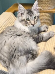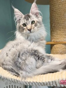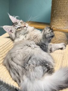 Nanook’s striking appearance, highlighted by his beautiful green eyes, perfectly showcases the charm of Maine Coon kittens. Even at just a few months old, Nanook already displays the hallmark features of his breed — large size, a majestic presence, and a playful, curious personality.