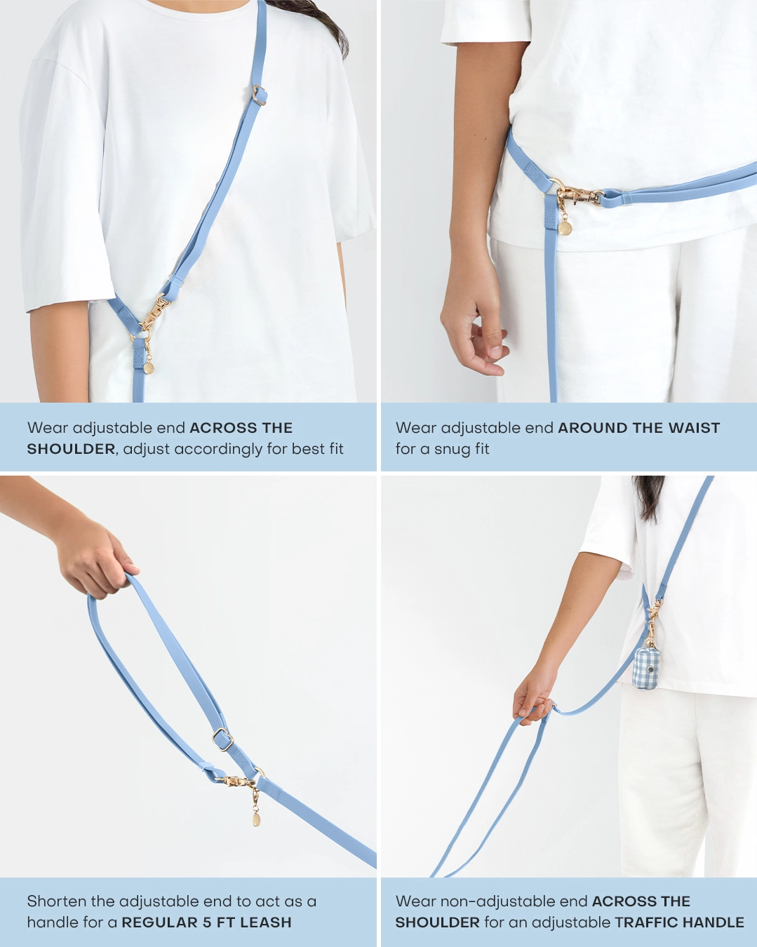 Meet the leash that does it all. The Sunny Tails 4-in-1 Convertible Hands Free Dog Leash is a total game-changer for pet parents and designed to give you total freedom while keeping your dog close and secure. It seamlessly transitions from cross-body to around-the-waist, reverses for use with the built-in traffic handle, and can also be held as a traditional leash. Whether you are heading out for a jog, running errands with your pup, or simply managing a coffee and phone while walking the dog, this leash keeps your hands free and fully in control.