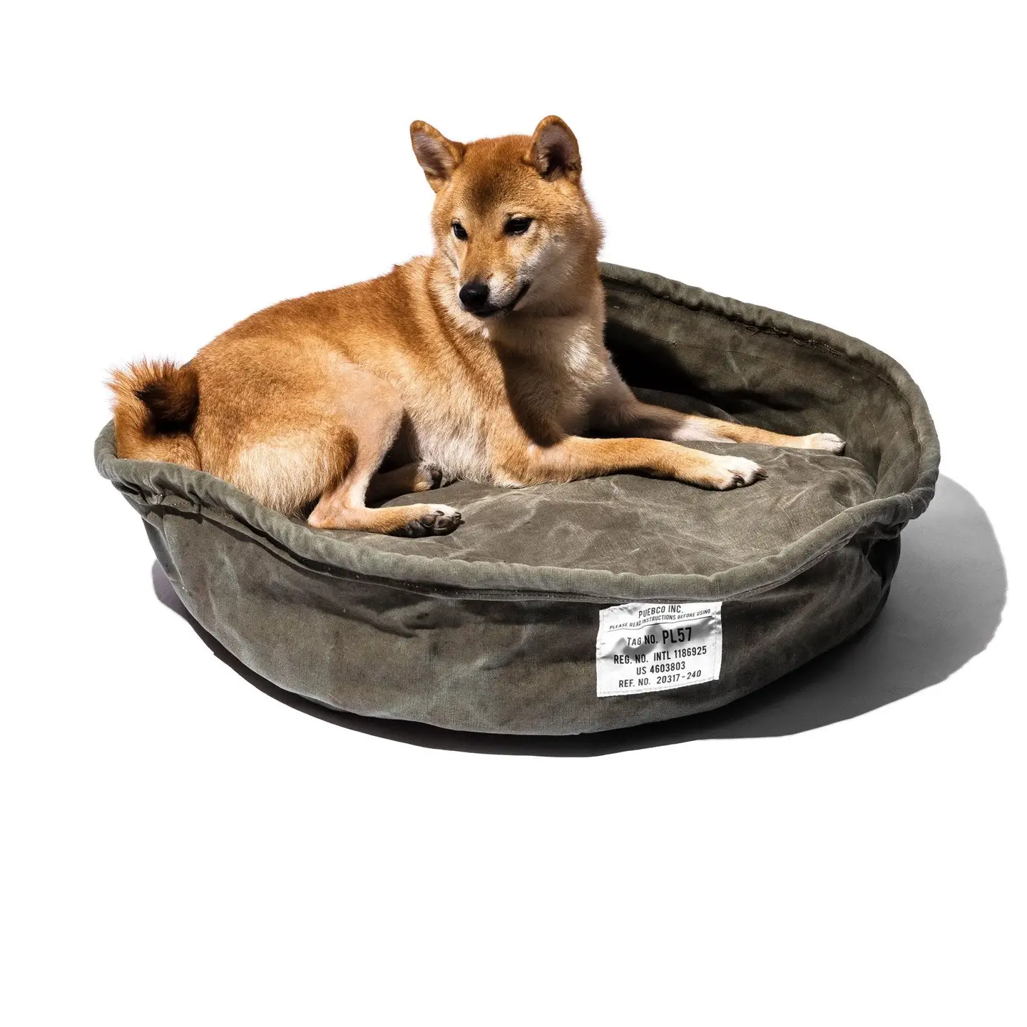 A few years later, when we talked about making a bed for pets, I remembered that cloth military bucket and used it as inspiration to create our own. The fabric was reused from tents sold by the military. After attaching rope and sewing it together, we washed it to look like well worn old jeans. We had several animals sleep in the trial product and they seemed quite comfortable.”