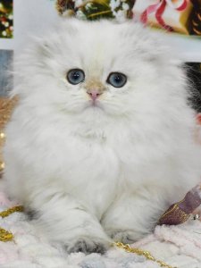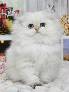 Pushinka’s fluffy coat, adorable folded ears, and big, round eyes showcase the enchanting charm of Highland Fold kittens. Her gentle nature and playful curiosity ensure she’ll bring joy and warmth wherever she goes. At just a few months old, Pushinka is already a shining example of the delightful traits of her breed.