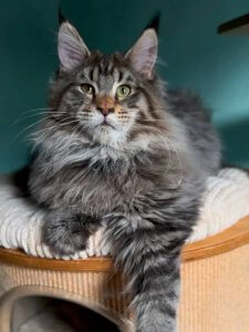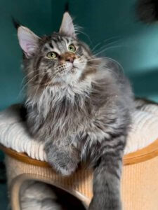 Sean Penn’s long, silky coat, tufted ears, and bushy tail showcase the grandeur of Maine Coon kittens. His striking green eyes sparkle with curiosity, and he is always eager to explore and engage. Even at just a few months old, Sean Penn already possesses the grace and affectionate nature that make Maine Coons such cherished companions.