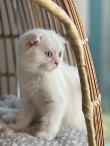 Snowy’s unique folded ears and round face are classic features of the Scottish Fold kittens, and even at just a few months old, she already displays the adorable traits that make this breed so beloved. Her soft fur and warm personality ensure that every moment with Snowy is filled with joy and comfort.