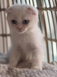 Meet Snowy, the charming Scottish Fold kitten whose lovable nature and distinctive folded ears make her an irresistible companion. With her plush coat and round, expressive eyes, Snowy is the epitome of sweetness and affection, ready to become a beloved member of your family.