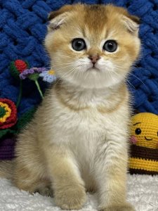 Meet Venera, the adorable and affectionate purebred Scottish Fold kitten whose distinctive folded ears and loving personality make her truly special. With her round, soulful eyes and irresistibly plush coat, Venera is sure to capture your heart and become a cherished member of your family.