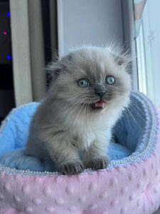 Venya’s plush coat and big round eyes perfectly embody the signature traits of the Highland Fold kittens. Whether he’s curious about his surroundings or curling up in your lap for a cozy snuggle, Venya knows how to capture hearts and brighten your day.