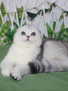 Viliola’s round eyes and sweet, playful personality make her the perfect addition to any family. At just a few months old, she already displays all the endearing traits of Scottish Fold kittens, from her folded ears to her round face and cuddly demeanor.